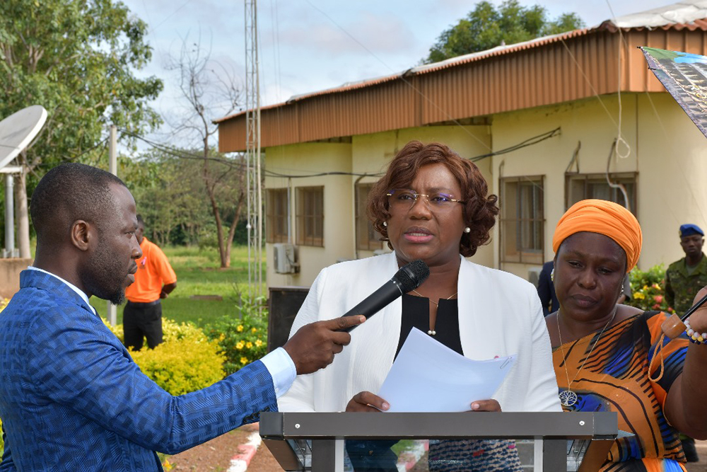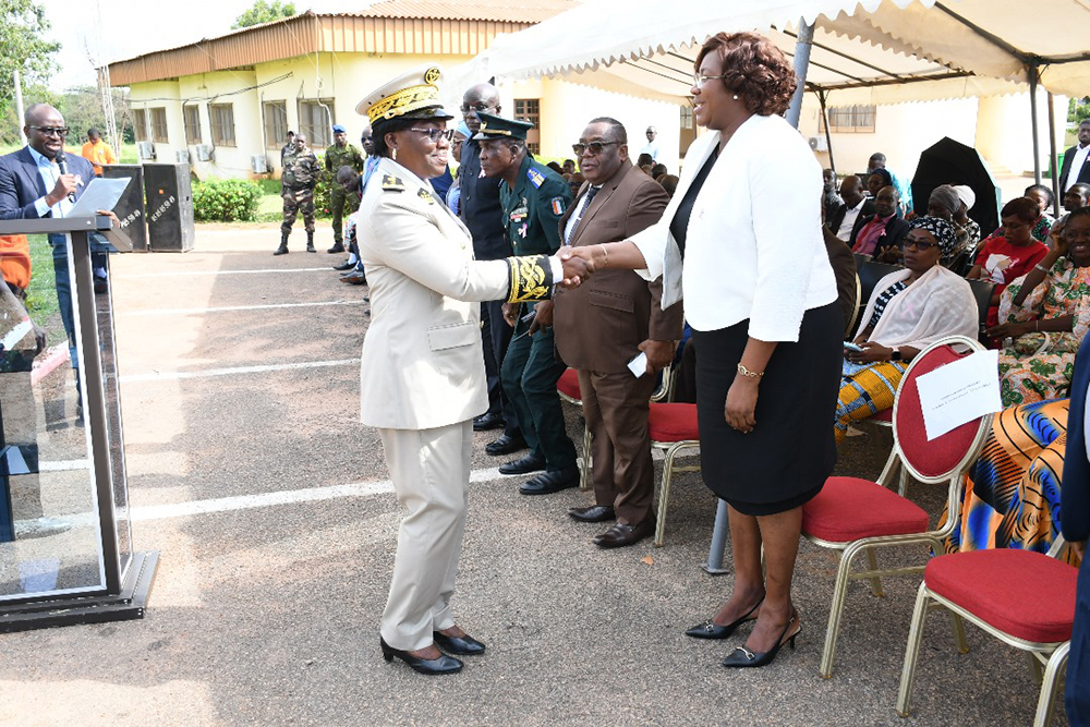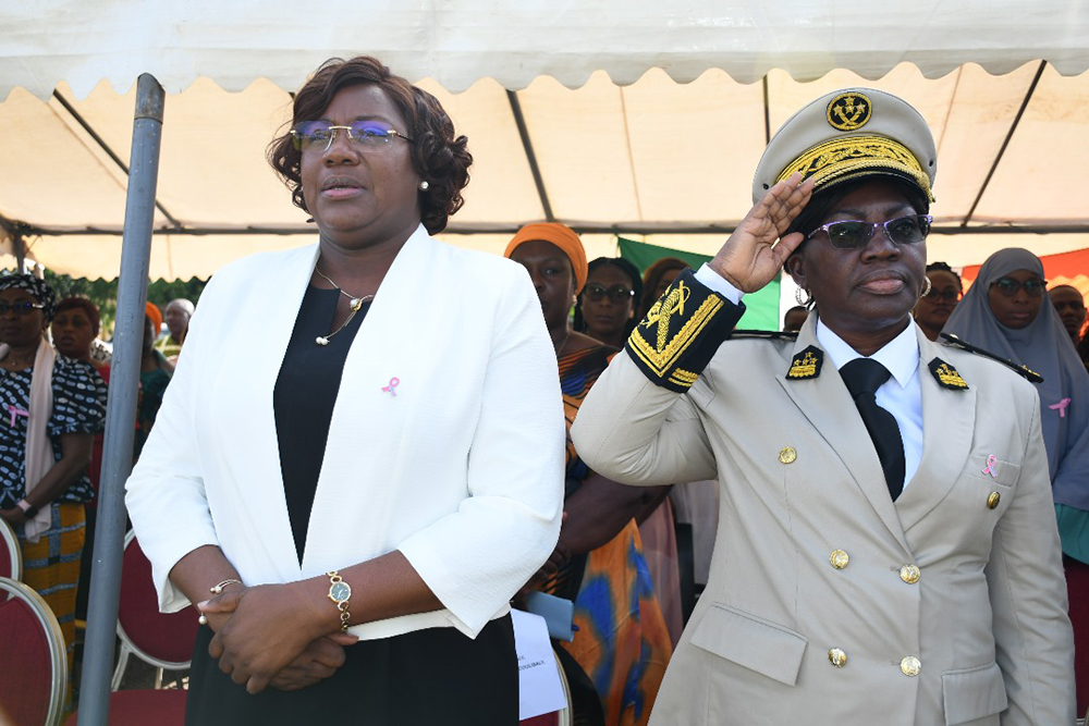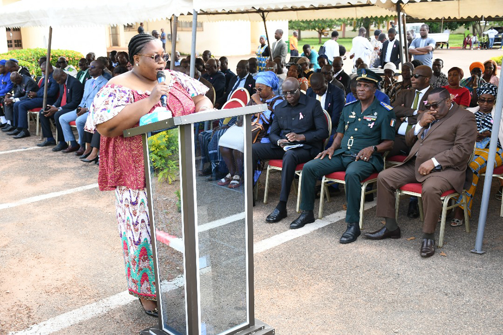Madame le Préfet du département de Dikodougou, Hortense AMANI épouse LOBOUET, marraine de la cérémonie a traduit sa gratitude à Madame la Présidente de l’UPGC pour le choix porté sur sa personne, mais également pour avoir instauré cette tradition du salut aux couleurs au sein de l’UPGC. Madame le Préfet tout en relevant le bien fondé du salut aux couleurs dans la vie d’une Nation, indiquera qu’: « au-delà de l’esprit de l’éveil patriotique, elle nous rappelle le devoir de respecter les valeurs de la République », avant d’inviter la communauté universitaire à être des citoyens modèles. Quant au cancer du sein, second volet de cette cérémonie, la marraine a relevé qu’il constitue un problème de santé publique du fait de sa morbidité et de sa mortalité élevées. Elle a, en outre invité l’auditoire à adopter les bonnes pratiques afin d’éviter cette maladie. Mieux, Madame le Préfet a instruit la communauté à être des ambassadeurs de la lutte contre la maladie à travers la sensibilisation. « La lutte contre le cancer est l’affaire de tous. Nous devons rester mobilisés même au-delà du 31 octobre pour continuer la sensibilisation, car la lutte contre le cancer est un combat de longue haleine qui nécessite l’engagement de tous. », a-t-elle conclu.