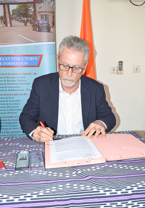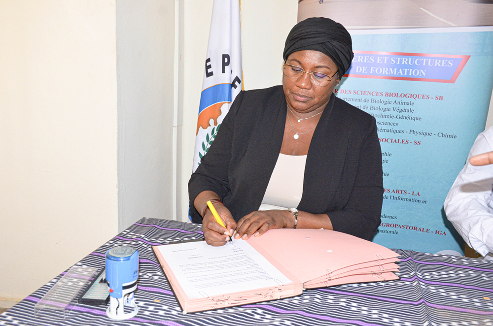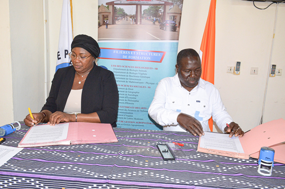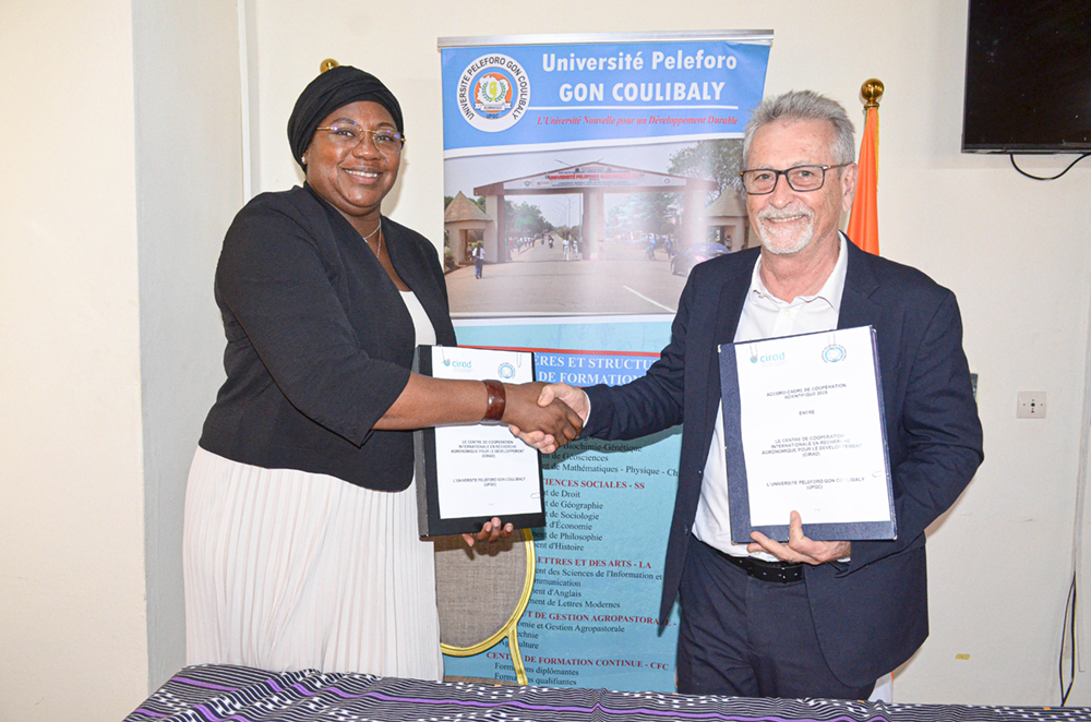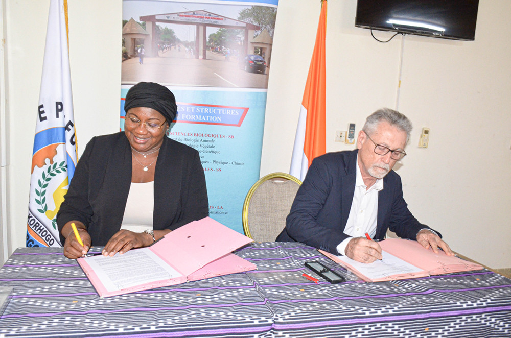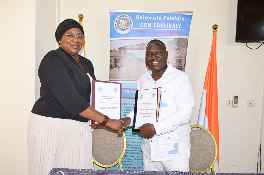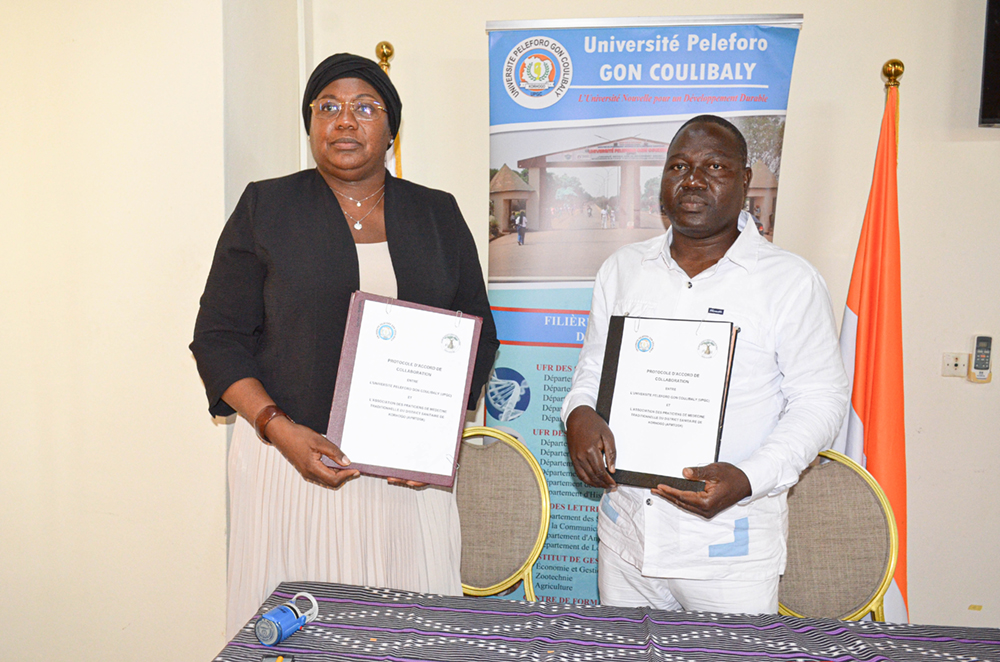 Dans le but de structurer leurs activités de recherche, de formation et d’innovation autour des thématiques prioritaires pour le développement durable des territoires d’une part, et de bâtir un pont entre la richesse des connaissances ancestrales des praticiens et l’expertise scientifique et technologique universitaire d’autre part, Madame la Présidente de l’UPGC, Professeure COULIBALY Aoua Sougo a paraphé un Accord-Cadre de Coopération Scientifique avec le Directeur Régional du CIRAD, Dr Serge MARLET, et un Protocole d’Accord de Collaboration avec le Président de l’APMTDSK, Monsieur OUATTARA Bakary.