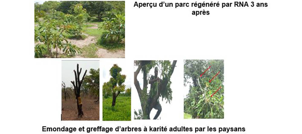 Dans l’état actuel de dégradation des parcs de karité constaté en Côte d’Ivoire, deux possibilités se présentent au programme d’amélioration du karité de Côte d’Ivoire hébergé par l’Université Peleforo Gon Coulibaly (UPGC) pour la restauration des peuplements de karité et l’amélioration de la qualité des produits par la recherche. Il s’agit de la Régénération Naturelle Assistée (RNA) associée à la technique de compostage en fosse pour la fumure des jeunes karités assistés et au greffage in situ (jeunes arbres et arbres adultes de karité)