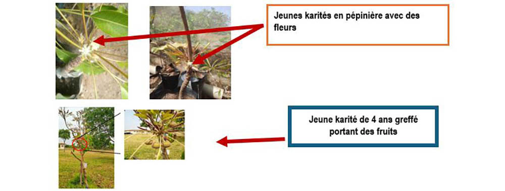 Le greffage horticole du karité a été implémenté en Côte d’Ivoire à travers les projets financés par le FIRCA (projet N° UFR-SBIO-UPGC/FIRCA/ N° 069/2016) et le FCIAD (projet N° : 1674/FIRCA/UPGC/FADCI-FCIAD/2017). Les travaux de recherche ont généré des résultats pertinents au nombre desquels on note la réduction de la durée de mise à fruits de l’arbre de karité de 20 ans à 5 ans.