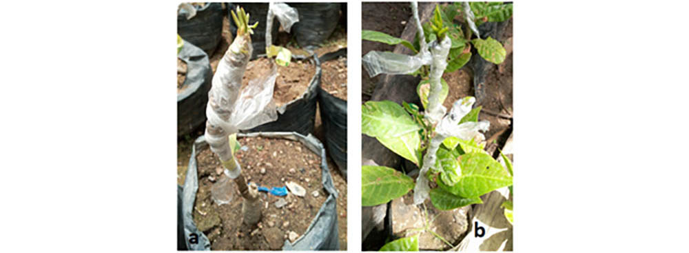 (a) Reprise d’un jeune plant greffé de karité en pépinière ; (b) Reprise d’un jeune plant greffé d’anacardier en pépinière